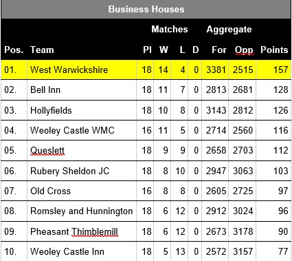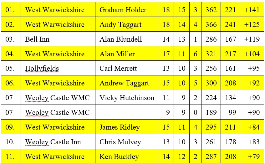 To indicate how well the team performed collectively and individually the league individual averages table was dominated by West Warwicks players with seven players featuring in the top 20 league performers. Notably topping the averages our own Graham Holder, with Andy Taggart in 2nd place. Our most improved player Alan Miller finished in 4th place with Andrew Taggart in 6th place. Jim Ridley finished in 9th place, with Ken Buckley in 11th place and Bernie Seery in 14th place.